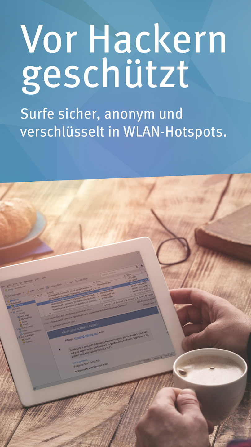 Ein VPN verschlüsselt Ihren Datenverkehr vom Smartphone zum VPN-Server und trägt so dazu bei, dass Sie ohne Bedenken öffentliche WLANs, Hotspots etc. benutzen können und trotzdem sicher surfen. Durch die Verschlüsselung können Cyberkriminelle Ihren Datenverkehr weder mitschneiden noch manipulieren.