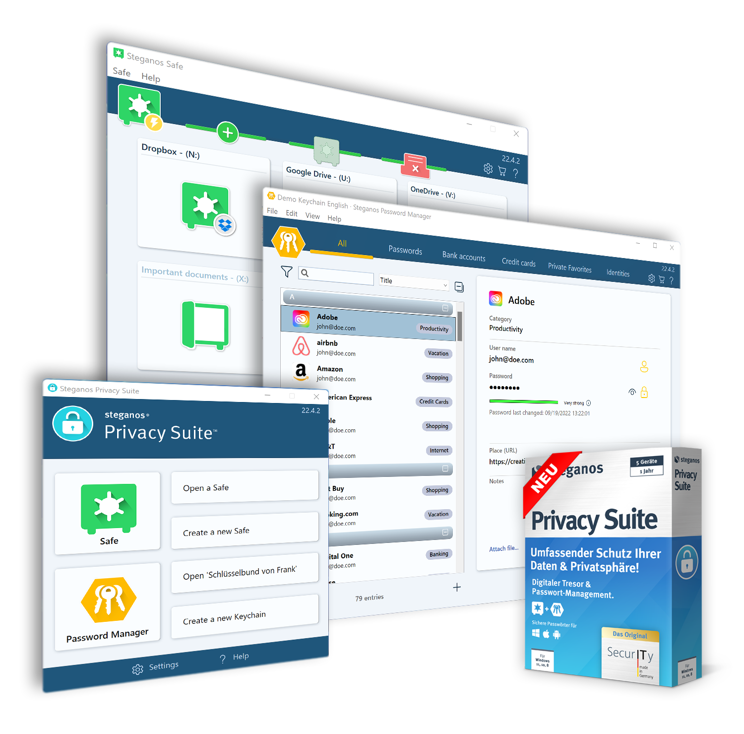 With Steganos Privacy Suite, users enjoy comprehensive protection of their digital privacy - without having to install multiple security programs. The Steganos Privacy Suite is the digital safe for all confidential data and offers sustainable, uncompromising protection against threats of all kinds. Backing up the user's data and blocking unauthorized access through secure encryption is one of the tasks of the security package. In addition, the integrated password manager provides users with a complete package for creating a digital keychain. An all-round solution for secure navigation through the digital world.
